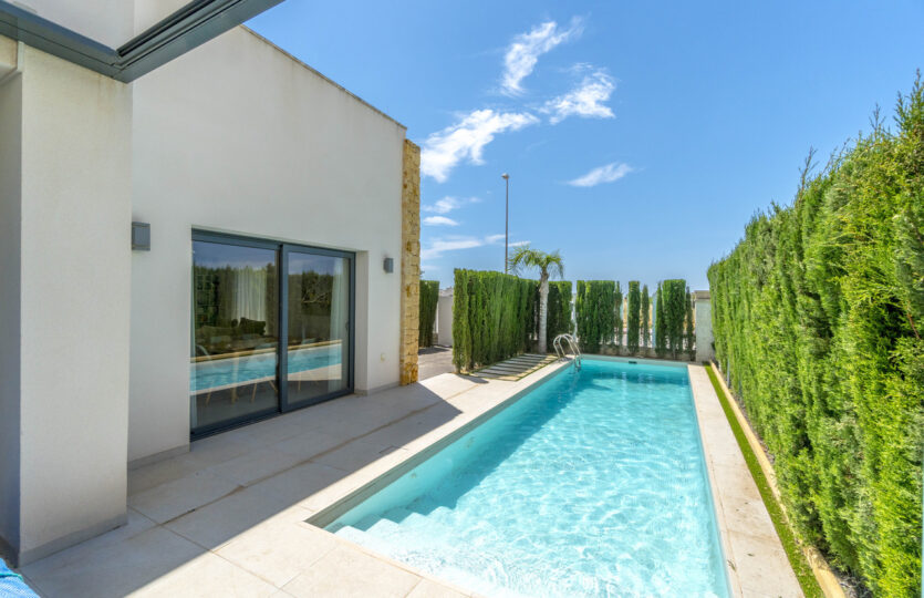 For sale: Stunning, modern 3 bedrooms, 2 bathrooms, 237m2 villa in Ciudad Quesada, Rojales. The property features an open plan kitchen/living area, one bedroom and a bathroom on the ground floor. Two further bedrooms and bathroom are located on the first floor. As well access to the private terrace and solarium. The property also benefits from a bright basement with a english patio. Private pool and barbecue area included.